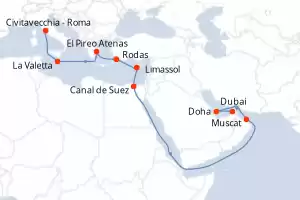 Itinerario : Civitavecchia - Roma, La Valetta, El Pireo Atenas, Rodas, Limassol, Canal de Suez, Canal De Suez, Muscat, Doha, Dubai