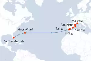Itinerario : Barcelona, Marsella, Palma de Mallorca, Alicante, Málaga, Tánger, Kings Wharf, Fort Lauderdale
