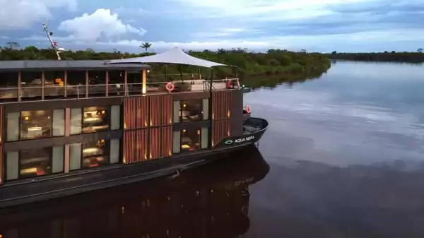 Diseñado por el estudio Studio Noor en Ciudad Ho Chi Minh, el Aqua Nera se inspira en las lagunas de aguas negras amazónicas y juega sutilmente con los contrastes entre un ambiente tenue y detalles de artesanía peruana, española y portuguesa. Con más de 62 metros de largo, este barco de diseño contemporáneo y líneas depuradas muestra una silueta elegante, concebida para navegar con facilidad por los meandros profundos y poco explorados de la Amazonía peruana. La decoración interior, sobria y sofisticada, rinde homenaje a la riqueza cultural de la región con guiños a los motivos tradicionales shipibo-conibo, los azulejos de Iquitos y materiales nobles.