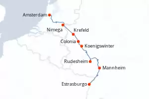 Itinerario : Amsterdam, Nimega, Xanten, Dusseldorf, Colonia, Koenigswinter, Coblenza, Mainz, Estrasburgo, Breisach, Basilea