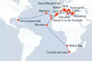Itinerario : Ciudad del Cabo, Walvis Bay, Mindelo, Santa Cruz de Tenerife, Gibraltar, Siracusa ( Sicilia), Corfú, Dubrovnik, Split, Kotor, El Pireo Atenas, Kusadasi, Chania, Salerno, Civitavecchia - Roma, Ajaccio, Santa Margherita, Cannes, Barcelona, Málaga, Cadiz, Tánger, Casablanca, Madeira, Punta Delgada, Fort Lauderdale