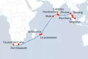 Itinerario : Singapur, Port Klang, Penang, Phuket, Hambantota, Colombo, Male, Ile Maurice, La possession, Port Elisabeth, Ciudad del Cabo