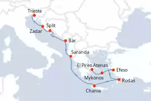 Itinerario : Trieste, Zadar, Split, Bar, Saranda, Chania, Rodas, Efeso, Mykonos, El Pireo Atenas