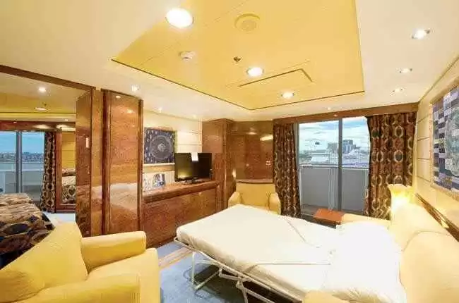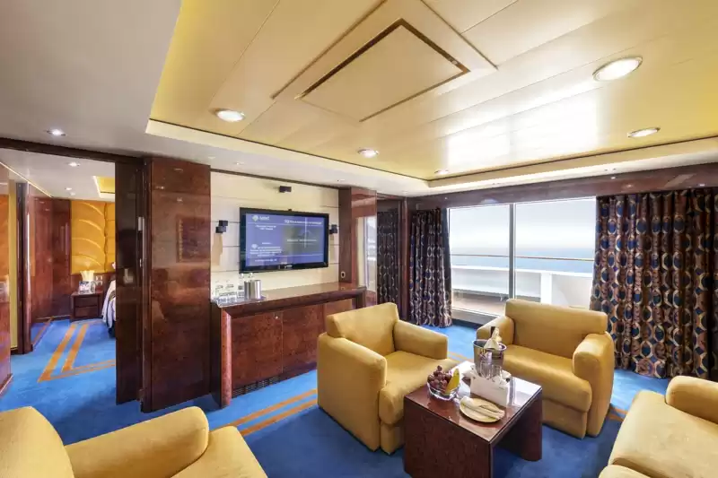 Las suites del MSC Fantasia ofrecen una experiencia de alta gama con una superficie que varía entre 22 y 43 m², y un balcón de 4 a 6 m² o una ventana panorámica fija en algunos casos. Incluyen una cama doble convertible, una sala de estar espaciosa con sofá, un amplio armario y un baño con ducha o bañera.