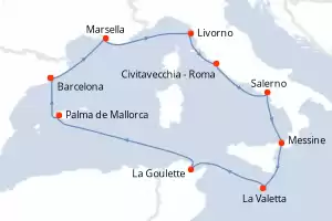 Itinerario : Barcelona, Marsella, Livorno, Civitavecchia - Roma, Salerno, Messine, La Valetta, La Goulette, Palma de Mallorca, Barcelona