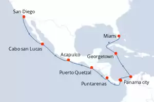 Itinerario : San Diego, Cabo san Lucas, Acapulco, Puerto Quetzal, Puntarenas, Panama city, Canal de Panama, Cartagena de Indias, Georgetown, Miami