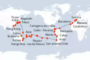 Francia, España, Marruecos, Canarias, Antillas, Costa Rica, Colombia, Panama, Chile, Polinesia, Tonga, Fiji, Australia, Japón, Corea del Sur Itinerario: Marsella , Barcelona , Casablanca , Santa Cruz de Tenerife , Barbados , Cartagena de Indias , Colón - Panama , Manta , Manta , Callao , Arica , San antonio Chile , San antonio Chile , Hango Roa - Isla de Pascua , Hango Roa - Isla de Pascua , Pitcairn , Papeete , Uturoa , Apia , Nukualofa , Suva , Mystery Island , Port Vila , Lifou , Sidney , Sidney , Brisbane , Cairns , Rabaul , Tokyo , Tokyo , Kobe , Nagasaki , Pusan , Keelung , Hong Kong Pensión completa Costa Deliziosa 84 días Camarote estándar Marsella 26/11/2025 desde 9449 € + desde 10579 € Tasas : + 550 € Niños gratis hasta los 17 años Club niños desde los 3 años Pensión completa Ver las ofertas
