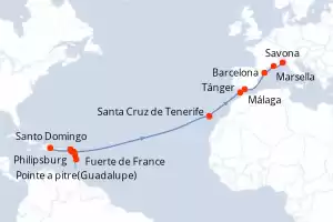 Antillas, Canarias, Marruecos, España, Francia, Italia Itinerario: Santo Domingo , Philipsburg , Fort-de-France , Pointe a pitre(Guadalupe) , St Kitts , Antigua , Santa Cruz de Tenerife , Tánger , Málaga , Barcelona , Marsella , Savona Pensión completa Costa Favolosa 21 días Camarote estándar Santo Domingo 01/03/2027 desde 1049 € Tasas : + 350 € Niños gratis hasta los 17 años Club niños desde los 3 años Pensión completa Ver las ofertas