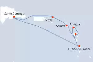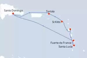 Antillas, Islas Vírgenes Itinerario: Santo Domingo , Fort-de-France , Pointe a pitre(Guadalupe) , St Kitts , Antigua , Tortola , Santo Domingo Pensión completa Costa Favolosa 8 días Camarote estándar Santo Domingo 07/12/2026 desde 319 € Tasas : + 200 € Niños gratis hasta los 17 años Club niños desde los 3 años Pensión completa Otros puertos de embarque : Pointe a pitre(Guadalupe) Ver las ofertas