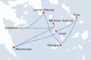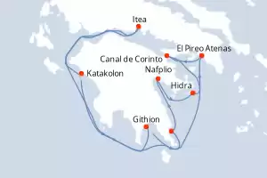 Grecia Itinerario: El Pireo Atenas , Canal de Corinto , Itea , Katakolon , Githion , Monemvasia , Nafplio , Hidra , El Pireo Atenas Pensión completa Le Champlain 8 días Camarote con balcón El Pireo Atenas 25/10/2026 desde 4480 € Tasas : + 350 € Bebidas Incluidas* Lujo a la francesa Conexión wifi ilimitado de cortesía Servicio de prestigio & lujo incluido Pensión completa Ver las ofertas