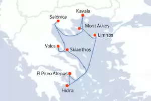 Itinerario : El Pireo Atenas, Skianthos, Volos, Salónica, Kavala, Mont Athos, Limnos, Hidra, El Pireo Atenas
