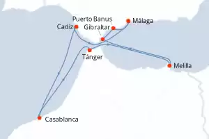 Itinerario : Málaga, Cadiz, Casablanca, Tánger, Melilla, Gibraltar, Puerto Banus, Málaga