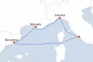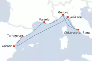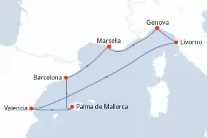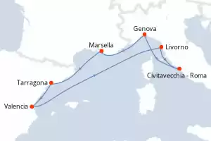 Francia, Italia, España Itinerario: Marsella , Tarragona , Valencia , Livorno , Civitavecchia - Roma , Genova , Marsella Pensión completa MSC Orchestra 8 días Camarote estándar Marsella 30/04/2026 desde 469 € Tasas : + 200 € niños gratis hasta 11 años Club para niños desde los 3 años Paquete de bebidas disponible Pensión completa Otros puertos de embarque : Tarragona Genova Civitavecchia - Roma Valencia Otras fechas : 7-14-21-28 mayo 26 4-11-18-25 jun. 26 2-9-16-23-30 jul. 26 Otras fechas Ver las ofertas
