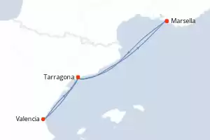 España, Francia Itinerario: Marsella , Tarragona , Valencia , Tarragona , Marsella Pensión completa MSC Orchestra 5 días Camarote estándar Marsella 29/10/2026 desde 329 € Tasas : + 120 € niños gratis hasta 11 años Club para niños desde los 3 años Paquete de bebidas disponible Pensión completa Ver las ofertas