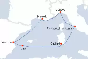 Francia, Italia, España Itinerario: Marsella , Valencia , Ibiza , Cagliari , Civitavecchia - Roma , Genova , Marsella Pensión completa MSC Musica 8 días Camarote estándar Marsella 13/05/2026 desde 589 € Tasas : + 200 € niños gratis hasta 11 años Club para niños desde los 3 años Paquete de bebidas disponible Pensión completa Otros puertos de embarque : Genova Valencia Civitavecchia - Roma Cagliari Otras fechas : 22-29 abr. 26 6-20-27 mayo 26 3-10-17-24 jun. 26 Otras fechas Ver las ofertas