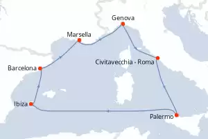Francia, España, Italia Itinerario: Marsella , Genova , Civitavecchia - Roma , Palermo , Ibiza , Barcelona , Marsella Pensión completa MSC Seaview 8 días Camarote estándar Marsella 15/05/2026 desde 629 € Tasas : + 200 € niños gratis hasta 11 años Club para niños desde los 3 años Paquete de bebidas disponible Pensión completa Otros puertos de embarque : Barcelona Genova Civitavecchia - Roma Palermo Otras fechas : 1-8-22-29 mayo 26 5-12-19-26 jun. 26 3-10-17-24-31 jul. 26 Otras fechas Ver las ofertas