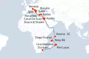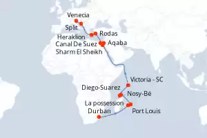 Francia, Sudafrica, Italia, Croacia, Grecia, Egipto, Jordanie, Seychelles, Madagascar, Maurice Itinerario: Durban , La possession , Port Louis , Diego-Suarez , Nosy-Bé , Victoria - SC , Aqaba , Sharm El Sheikh , Canal De Suez , Canal de Suez , Rodas , Heraklion , Split , Venecia Pensión completa MSC Armonia 27 días Camarote estándar Durban 01/04/2027 desde 1589 € Tasas : + 350 € niños gratis hasta 11 años Club para niños desde los 3 años Paquete de bebidas disponible Pensión completa Ver las ofertas