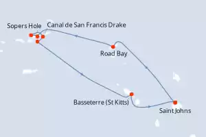 Itinerario : Saint Johns, Gustavia, Canal de San Francis Drake, Norman Island, Sopers Hole, Islas Virgenes, Spanish Town, Jost Van Dyke, Philipsburg, Basseterre (St Kitts), South Friar's beach, Saint Johns