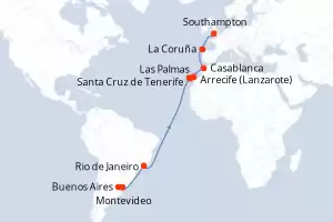 Pasaje Sudamericano Itinerario: Buenos Aires , Buenos Aires , Montevideo , Rio de Janeiro , Las Palmas , Arrecife (Lanzarote) , Santa Cruz de Tenerife , Casablanca , La Coruña , Southampton Pensión completa Majestic Princess 23 días Camarote estándar Buenos Aires 09/02/2027 desde 639 € Tasas : + 874 € Pensión completa Ver las ofertas