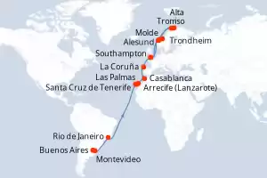 Gran Aventura de la Aurora Boreal Itinerario: Buenos Aires , Buenos Aires , Montevideo , Rio de Janeiro , Las Palmas , Arrecife (Lanzarote) , Santa Cruz de Tenerife , Casablanca , La Coruña , Southampton , Alesund , Trondheim , Tromso , Tromso , Alta , Molde , Southampton Pensión completa Majestic Princess 37 días Camarote estándar Buenos Aires 09/02/2027 desde 1945 € Tasas : + 999 € Pensión completa Ver las ofertas