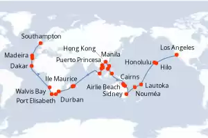 Fidji (islas), Singapur, Francia, Vietnam, Estados Unidos, China, Portugal, Reino Unido, España, Filipinas, Senegal, Namibia, Indonesia, Sudafrica, Australia, Nueva Caledonia, Maurice Itinerario: Los Angeles , Hilo , Honolulu , date , Lautoka , Nouméa , Sidney , Sidney , Airlie Beach , Townsville , Cairns , Bitung , Puerto Princesa , Manila , Hong Kong , Hong Kong , Chan May , Nha Trang , Phu My , Singapur , Singapur , Ile Maurice , Isla de la Reunion , Durban , Port Elisabeth , Ciudad del Cabo , Ciudad del Cabo , Walvis Bay , Dakar , Santa Cruz de Tenerife , Madeira , Madeira , Southampton Pensión completa Queen Victoria 84 días Camarote estándar Los Angeles 05/02/2027 desde 13166 € Tasas incluidas Pensión completa Ver las ofertas