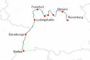 Alemania, Francia, Suiza Itinerario: Basilea , Estrasburgo , Ludwigshafen , Frankfurt , Miltenberg , Wertheim , Würzburg , Eltmann , Nuremberg Pensión completa AmaPrima 8 días Camarote exterior Basilea 17/03/2027 desde 3192 € Tasas : + 266 € Pensión completa Otras fechas : 28 abr. 27 23 jun. 27 4 ago. 27 Otras fechas Ver las ofertas