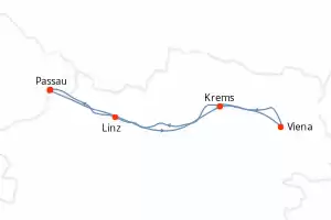 Itinerario : Budapest, Vilshofen, Budapest, Passau, Linz, Bratislava, Grein, Viena, Grein, Melk, Spitz, Krems, Melk, Viena, Durnstein, Spitz, Bratislava, Viena, Linz, Passau, Budapest, Vilshofen, Budapest