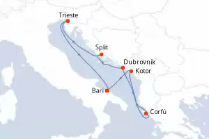 Italia, Grecia, Malta, Croacia Itinerario: Trieste , Bari , Corfú , Siracusa ( Sicilia) , La Valetta , Split , Trieste Pensión completa Costa Deliziosa 8 días Camarote estándar Trieste 31/10/2026 desde 719 € + desde 1199 € Tasas : + 200 € Niños gratis hasta los 17 años Club niños desde los 3 años Pensión completa Otros puertos de embarque : Bari Otras fechas : 3-17 oct. 26 Ver las ofertas