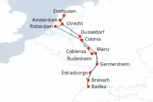 Paises Bajos, Alemania, Suiza, Francia Itinerario: Colonia , Rotterdam , Enkhuizen , Amsterdam , Amsterdam , Utrecht , Dusseldorf , Coblenza , Rudesheim , Rudesheim , Germersheim , Estrasburgo , Basilea , Basilea , Breisach , Mannheim , Colonia Pensión completa MS Rhein Melodie 12 días Camarote exterior Colonia 09/07/2026 desde 1799 € Tasas : + 100 € Pensión completa Ver las ofertas