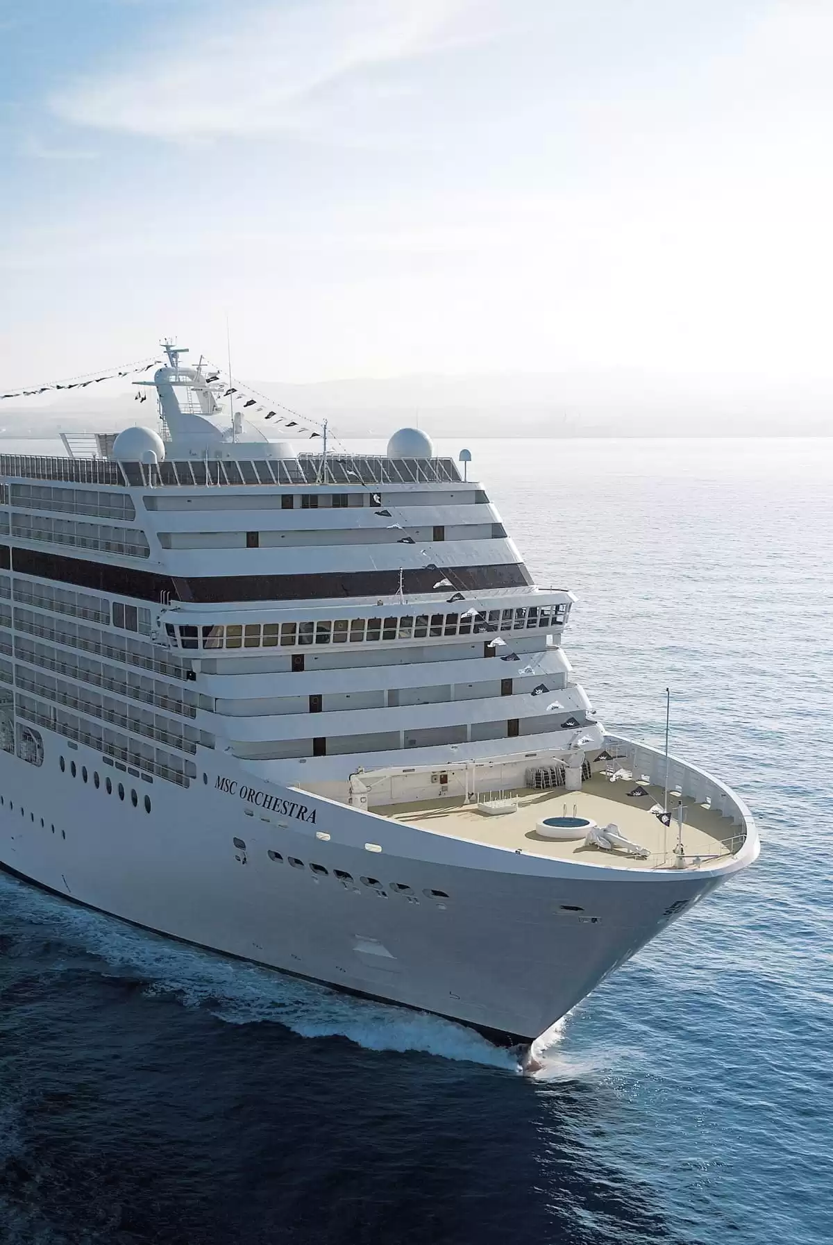 Ver las 75 fotos siguientes Crucero MSC Orchestra : Francia,Italia,España saliendo de Marsella 4.3/5 MSC Orchestra 08/12/2025 8 días / 7 noches Camarote estándar Otros puertos disponibles Marsella Barcelona Genova Paga en 4 cuotas desde 103 €/mes desde 209 € + desde - Tasas : + 200 € Ver disponibilidad niños gratis hasta 11 años* Más información Los niños viajan gratis hasta los 11 años pagando únicamente las tasas portuarias, el seguro, los vuelos y los traslados (cuando sean necesarios). Oferta válida para 1 o 2 niños viajando en el camarote en compañía de dos adultos. Club para niños desde los 3 años* Más información Clubs para niños abiertos todos los días, gratuitos para niños de entre 3 y 17 años (agrupados por edad). Actividades y menús especiales en las comidas durante todo el crucero. Paquete de bebidas disponible* Más información Consulta los paquetes de bebidas disponibles con tu agente especializado. Pensión completa Los niños viajan gratis hasta los 11 años pagando únicamente las tasas portuarias, el seguro, los vuelos y los traslados (cuando sean necesarios). Oferta válida para 1 o 2 niños viajando en el camarote en compañía de dos adultos. Clubs para niños abiertos todos los días, gratuitos para niños de entre 3 y 17 años (agrupados por edad). Actividades y menús especiales en las comidas durante todo el crucero. Consulta los paquetes de bebidas disponibles con tu agente especializado. Experiencias disponibles: Crucero con salida desde Marsella Barcelona Genova Fechas de Salidas noviembre 2025 diciembre 2025 enero 2026 febrero 2026 marzo 2026 abril 2026 noviembre 2026 diciembre 2026 enero 2027 febrero 2027 marzo 2027 abril 2027 Lunes 17/11/2025 desde 1 149 € Lunes 24/11/2025 desde 219 € Lunes 01/12/2025 desde 249 € Lunes 08/12/2025 desde 209 € Lunes 15/12/2025 desde 219 € Lunes 22/12/2025 desde 709 € Lunes 29/12/2025 desde 969 € Lunes 05/01/2026 desde 319 € Lunes 12/01/2026 desde 329 € Lunes 19/01/2026 desde 349 € Lunes 26/01/2026 desde 279 € Lunes 02/02/2026 desde 239 € Lunes 09/02/2026 desde 429 € Lunes 16/02/2026 desde 469 € Lunes 23/02/2026 desde 369 € Lunes 02/03/2026 desde 319 € Lunes 09/03/2026 desde 329 € Lunes 16/03/2026 desde 359 € Lunes 23/03/2026 desde 449 € Lunes 30/03/2026 desde 569 € Lunes 06/04/2026 desde 679 € Lunes 13/04/2026 desde 659 € Lunes 09/11/2026 desde 559 € Lunes 23/11/2026 desde 359 € Lunes 30/11/2026 desde 329 € Lunes 07/12/2026 desde 329 € Lunes 14/12/2026 desde 329 € Lunes 21/12/2026 desde 619 € Lunes 28/12/2026 desde 1 019 € Lunes 04/01/2027 desde 369 € Lunes 11/01/2027 desde 259 € Lunes 18/01/2027 desde 259 € Lunes 25/01/2027 desde 259 € Lunes 01/02/2027 desde 309 € Lunes 08/02/2027 desde 309 € Lunes 15/03/2027 desde 409 € Lunes 22/03/2027 desde 579 € Lunes 29/03/2027 desde 579 € Lunes 05/04/2027 desde 499 € Mi categoría de cabina Cabina Interna vuelos incluidos /p.p. + /p.p. Completo Cabina Exterior vuelos incluidos /p.p. + /p.p. Completo Cabina Balcón vuelos incluidos /p.p. + /p.p. Completo Suite vuelos incluidos /p.p. + /p.p. Completo Mis opciones de cabina Cabina Básica /p.p. Calcula tu presupuesto MEJOR PRECIO Elección de cabina Pensión completa Completo Cabina Junior /p.p. Calcula tu presupuesto Superficie desde 15m² Elección de cabina Pensión completa Completo Cabina de lujo /p.p. Calcula tu presupuesto Superficie desde 19m² Elección de cabina Pensión completa Completo Cabina Premium /p.p. Calcula tu presupuesto Superficie desde 25m² Elección de cabina Pensión completa Completo Cabina Básica /p.p. Calcula tu presupuesto MEJOR PRECIO Elección de cabina Pensión completa Completo Cabina Junior /p.p. Calcula tu presupuesto Superficie desde 15m² Elección de cabina Pensión completa Completo Cabina de lujo /p.p. Calcula tu presupuesto Superficie desde 19m² Elección de cabina Pensión completa Completo Cabina Premium /p.p. Calcula tu presupuesto Superficie desde 25m² Elección de cabina Pensión completa Completo Cabina Básica /p.p. Calcula tu presupuesto MEJOR PRECIO Elección de cabina Pensión completa Completo Cabina Junior /p.p. Calcula tu presupuesto Superficie desde 15m² Elección de cabina Pensión completa Completo Cabina de lujo /p.p. Calcula tu presupuesto Superficie desde 19m² Elección de cabina Pensión completa Completo Cabina Premium /p.p. Calcula tu presupuesto Superficie desde 25m² Elección de cabina Pensión completa Completo Cabina Aurea /p.p. Calcula tu presupuesto SUPERFICIE a partir de 19m² Elección de cabina Embarque prioritario Acceso exclusivo al Top Exclusive Solarium 40% de descuento en el paquete de spa Completo Junior /p.p. Calcula tu presupuesto Superficie desde 15m² Elección de cabina Embarque prioritario Acceso exclusivo al Solarium Top Exclusive 40% de descuento en el paquete de spa Completo Deluxe /p.p. Calcula tu presupuesto Superficie desde 19m² Elección de cabina Embarque prioritario Acceso exclusivo al Solarium Top Exclusive 40% de descuento en el paquete de spa Completo Premium /p.p. Calcula tu presupuesto Superficie desde 25m² Elección de cabina Embarque prioritario Acceso exclusivo al Solarium Top Exclusive 40% de descuento en el paquete de spa Completo Gran Suite /p.p. Calcula tu presupuesto Superficie desde 35m² Elección de cabina Embarque prioritario Acceso exclusivo al Solarium Top Exclusive 40% de descuento en el paquete de spa Completo Salida Cabine Standard Deluxe Calcula tu presupuesto Pago inicial desde /p.p. FLEXIBILIDAD DE LA RESERVA - Cambio de crucero, con coste* COMODIDAD - Modernos barcos y elegantes camarotes - MSC for Me (donde esté disponible)** GASTRONOMÍA - Opción de reservar la selección de bebidas a mejor precio con la Tarifa Todo Incluido - Bufé con una amplia oferta gastronómica - Restaurantes principales que sirven comidas gourmet adaptadas a una variedad de restricciones dietéticas DEPORTE Y ENTRETENIMIENTO - P
